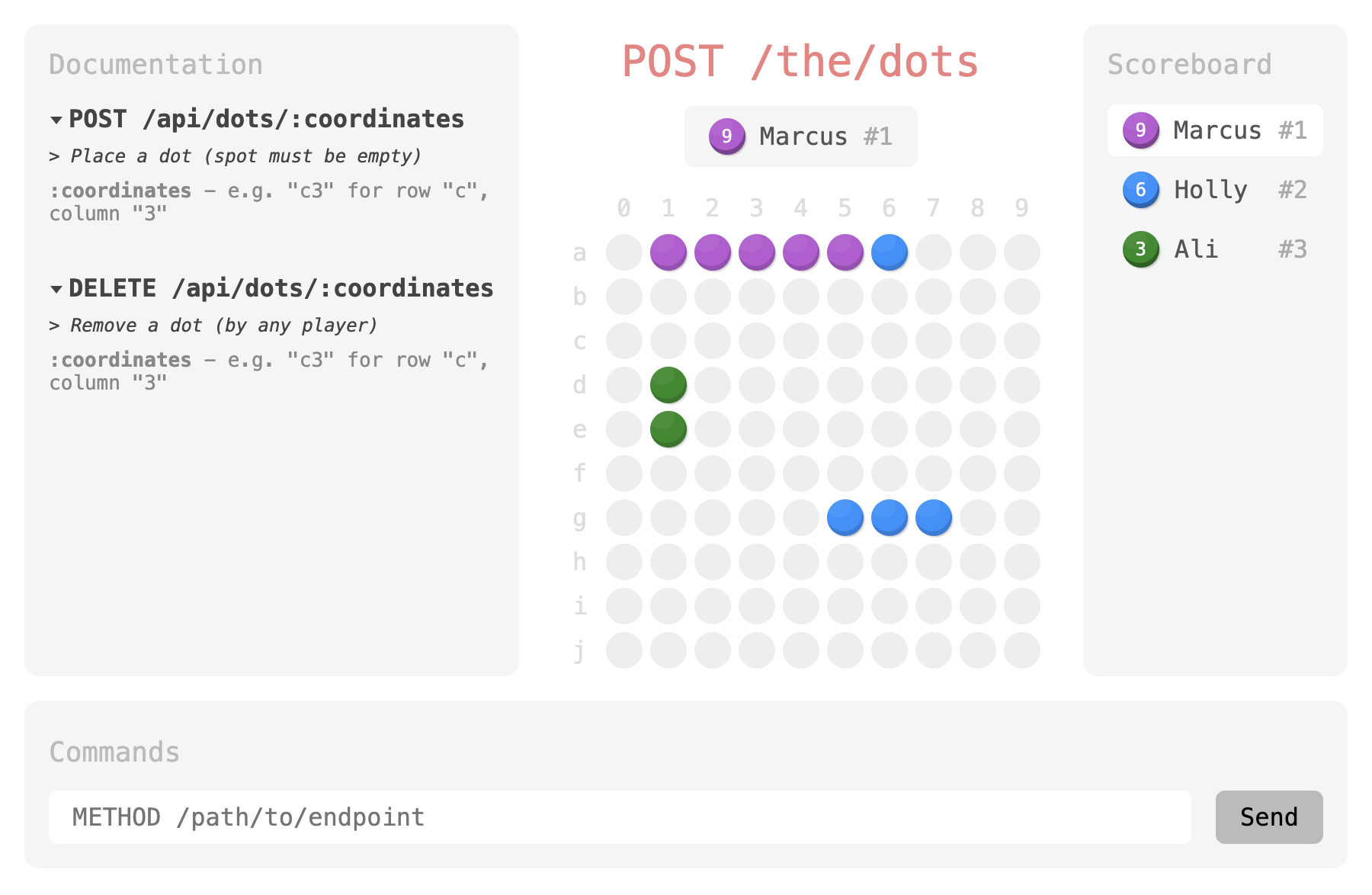 Fill the board to win by sending HTTP requests. Made to play with my students on graduation day, using web technologies we learned in class.
